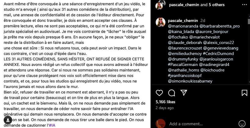 而她的同事显然选择了站在她这一边,Chemin 继续写道:“其他 31 名配音演员毫不犹豫地拒绝了签署这份协议。我们写了一封集体拒绝信,发给了发行商,正在等待回复。如果我们现在不团结起来,将保护我们声音地条款正式添加到我们的合同中——不只是我们,而是每个电子游戏配音工作室——我们将永远得不到一个(公正的协议),我们将走向灾难。”