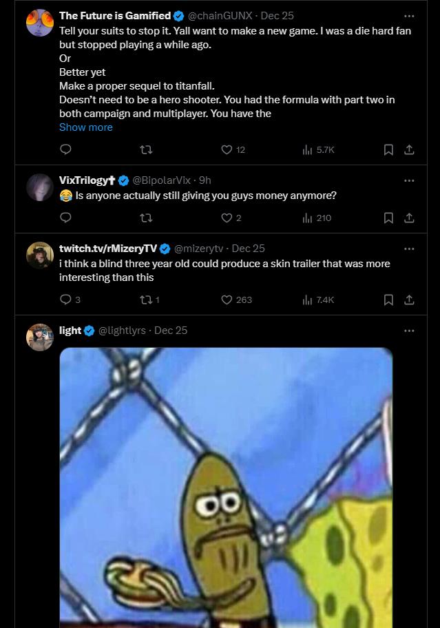 近日在《Apex英雄》官方推特中发布有关皮肤等内容新年促销的推文下,许多玩家表达了对这款游戏的失望。不仅有人表示将要放弃《Apex英雄》,还有玩家指出作为实时服务游戏目前已经“不再有趣”,甚至还有玩家表示重生不要再出这些皮肤,而是时候考虑制作一款《泰坦陨落》的新作了。