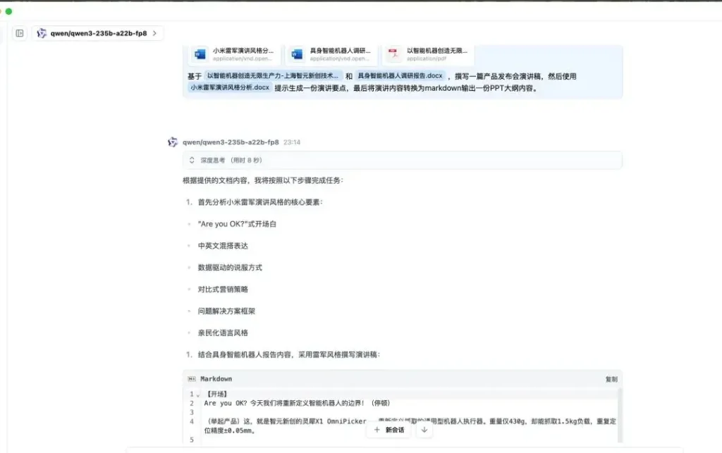整个过程在一个指令中完成,DeepChat 作为 Agent 自动协调多个资源,完成了从内容撰写到演讲稿和 PPT 大纲的全流程工作。